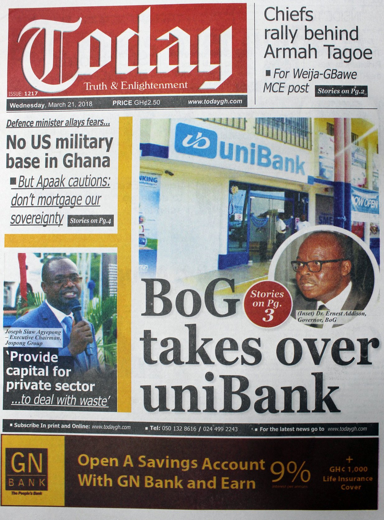 edition news Home » myJoyOnline » Wed 21st Mar, 2018 » Front pages: Wednesday, March 21, 2018 Front pages: Wednesday, March 21, 2018 Front pages: Wednesday, March 21, 2018 myJoyOnline Wed 21st Mar, 2018 07:03 Read Full Story Advertise Here contact ads[@]ghheadlines.com Related Items edition news edition news Wed 21st Mar, 2018 07:03 myJoyOnline Related Items edition news